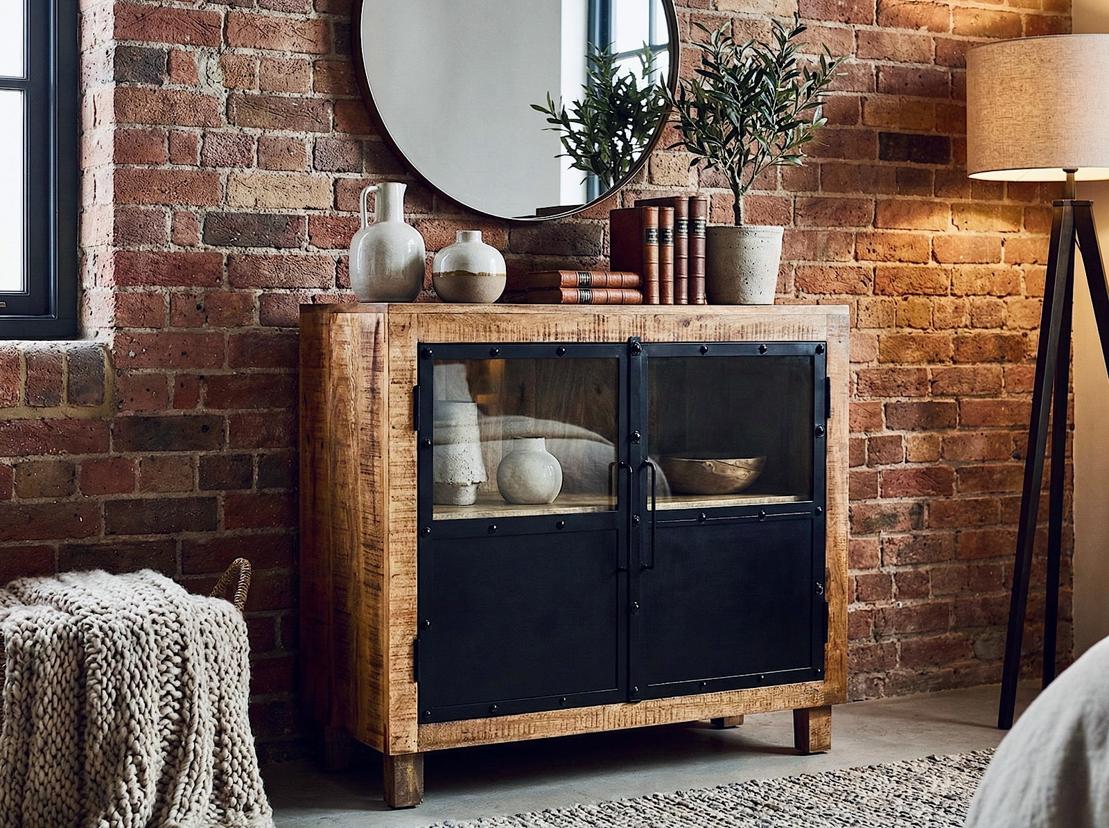 Le charme de l'ancien rencontre le design industriel. Ce petit buffet combine le grain unique du bois de manguier avec des accents métalliques noirs tranchés pour un look qui ne passe pas inaperçu. Parfait comme bar, meuble d'entrée ou petite crédence.