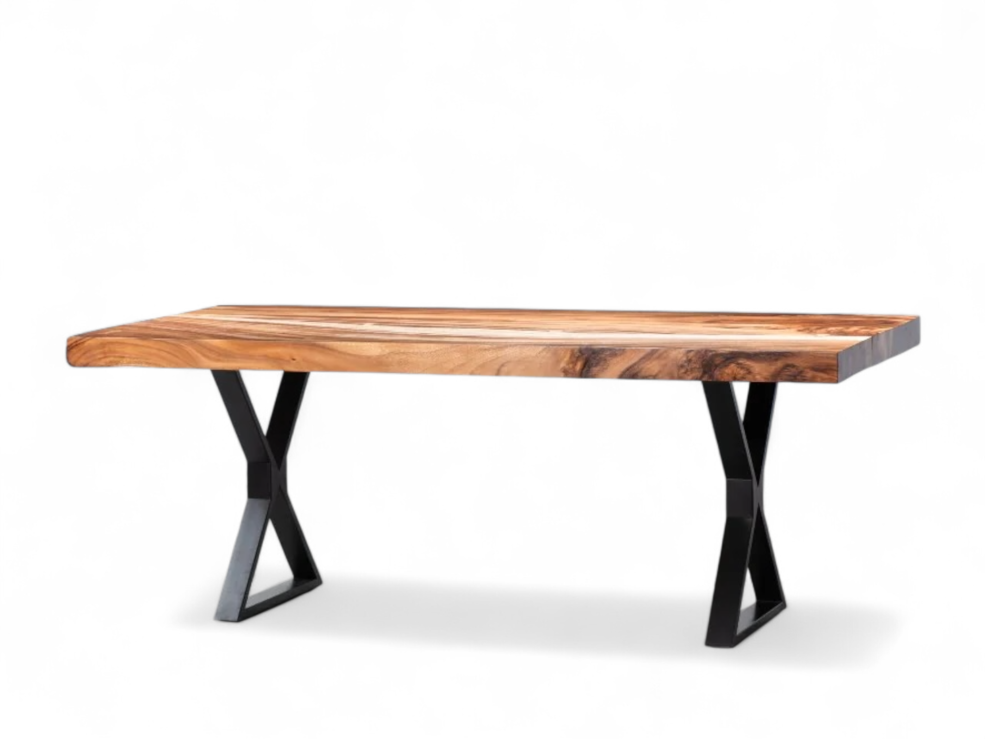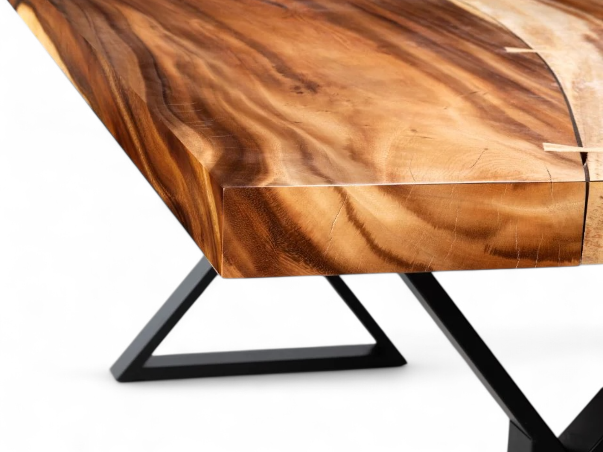 Table à dîner, coupe droite, en bois de suar massif de 2.5 pouces (6 à 7 cm) d'épaisseur, fabriquée à partir d'une slab provenant d'un seul morceau de tronc. Chaque table est unique, et les quantités sont limitées. Pattes en metal noir au choix. Nous vous contacterons pour valider tous les details avec vous.