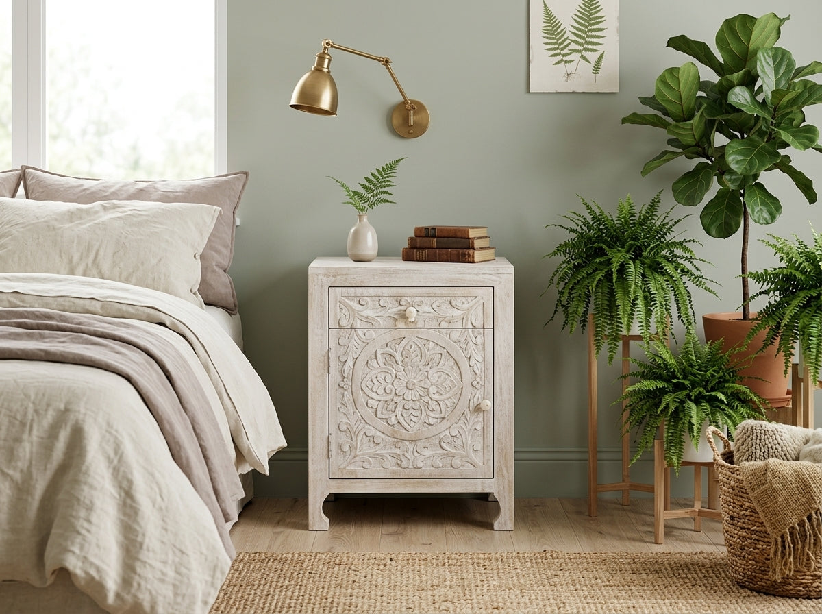 Cette table de nuit en bois de manguier blanchi apporte une touche naturelle à votre chambre. Dotée de deux tiroirs spacieux, elle est idéale pour garder vos essentiels de nuit bien organisés et à portée de main.