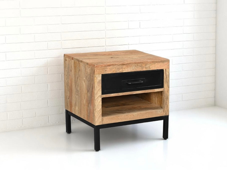 Cette table de nuit en bois de manguier et métal allie charme rustique et robustesse. Son design minimaliste la rend parfaite pour une chambre moderne ou industrielle.