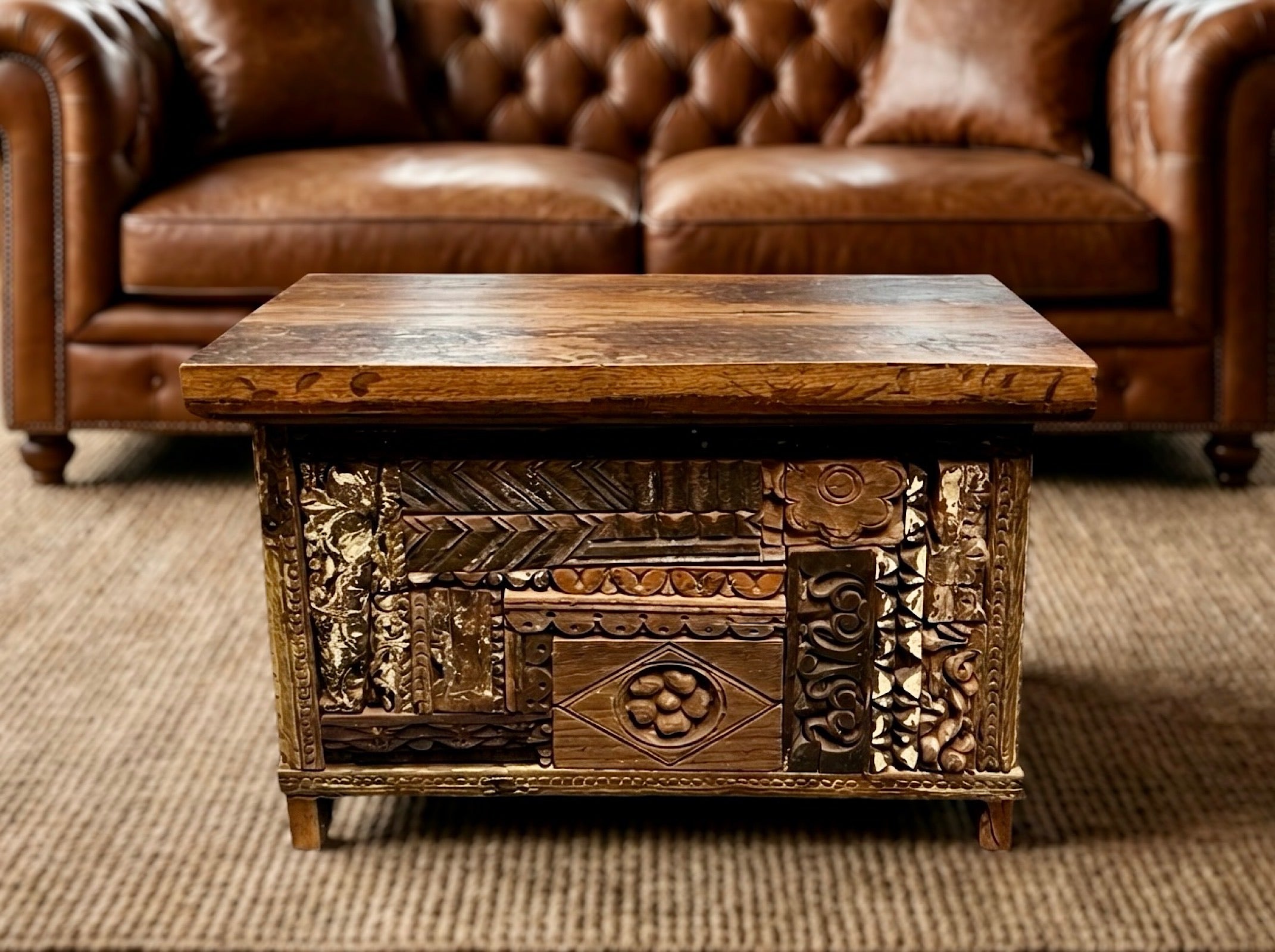 Coffre en bois de teck décoré de gravures sculptées à la main. À la fois décoratif et fonctionnel, il peut servir de rangement tout en faisant office de table basse ou de meuble d’appoint. Les motifs gravés et le travail du bois donnent à chaque pièce un caractère unique.