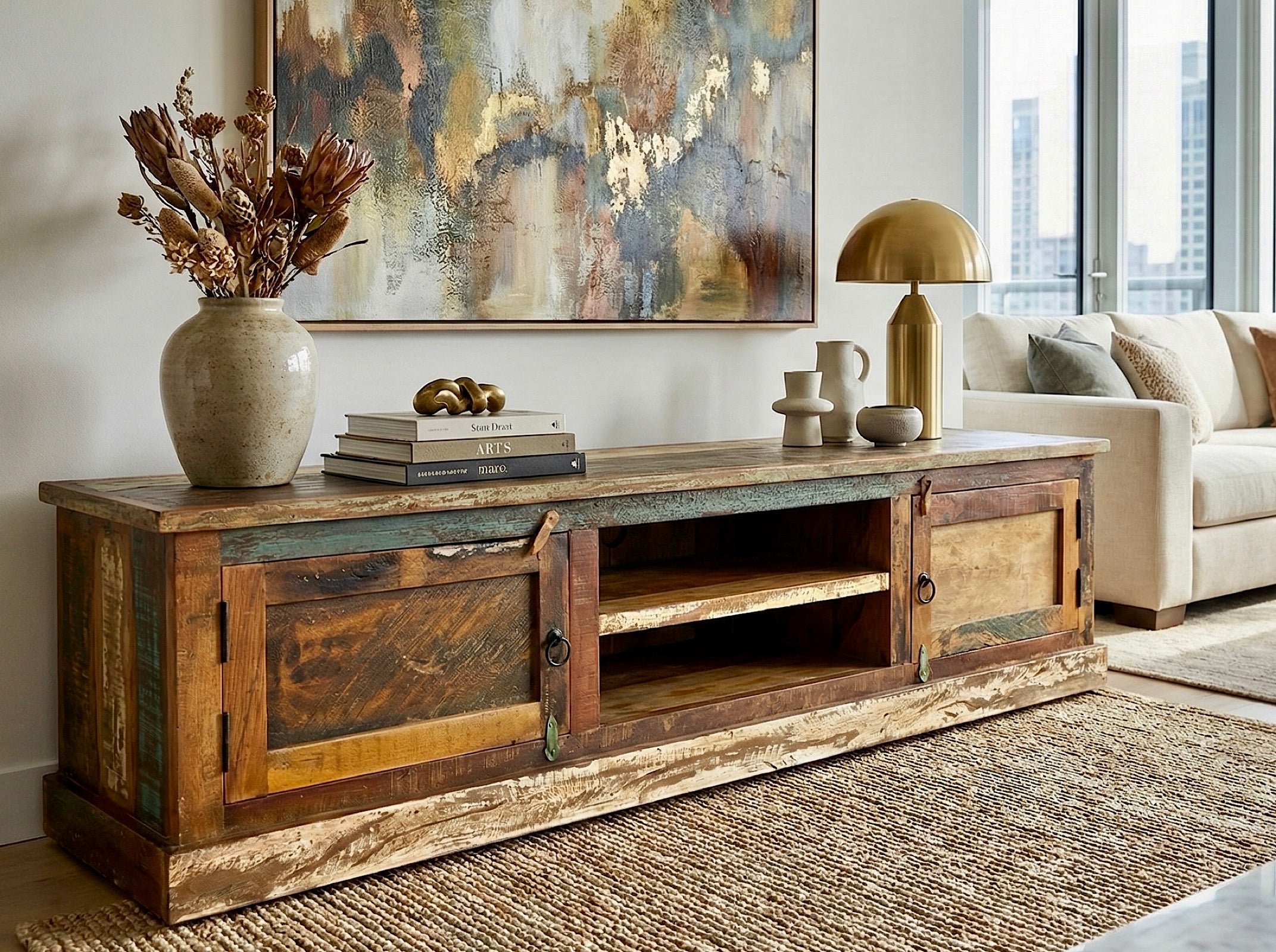 Recycled wood TV cabinet with 2 doors