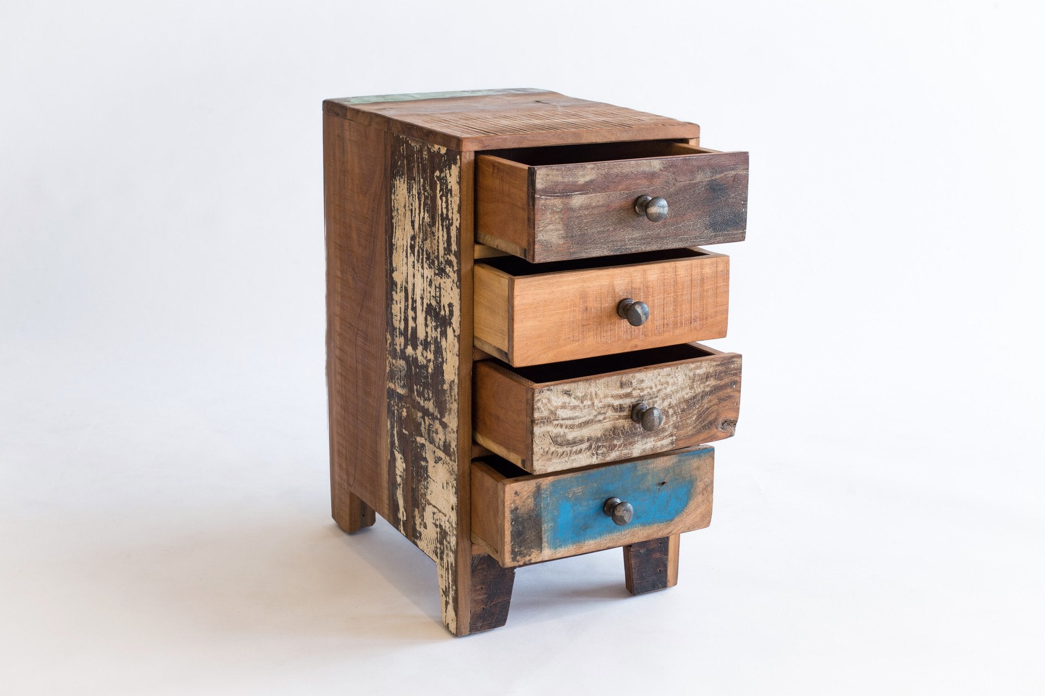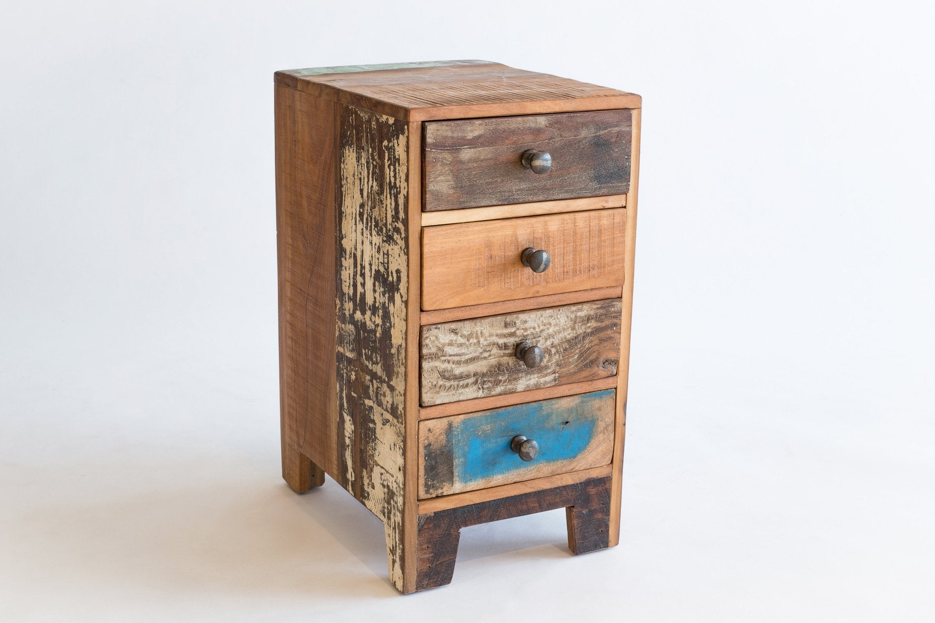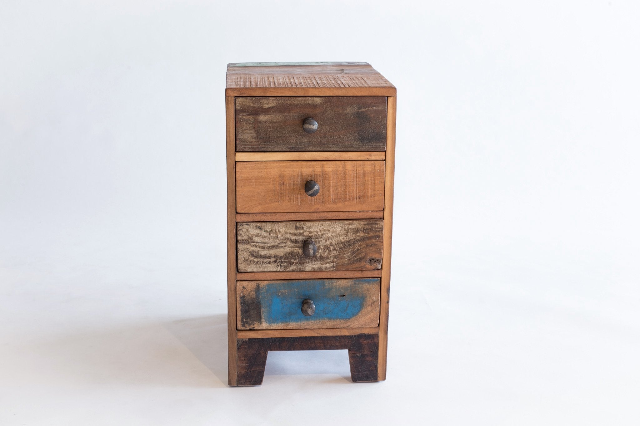 Add a touch of rustic charm to your bedroom with this recycled wood nightstand. Its four drawers offer practical storage space while bringing a warm and eco-friendly aesthetic.