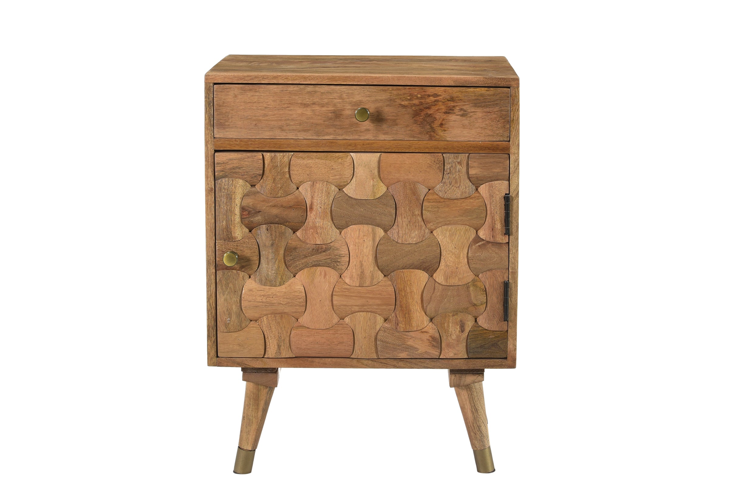 The Sajara bedside table, made of mango wood, is equipped with a drawer and a door and offers practical and elegant storage. Its elaborate design with carved mango wood inserts adapts perfectly to any bedroom decor.