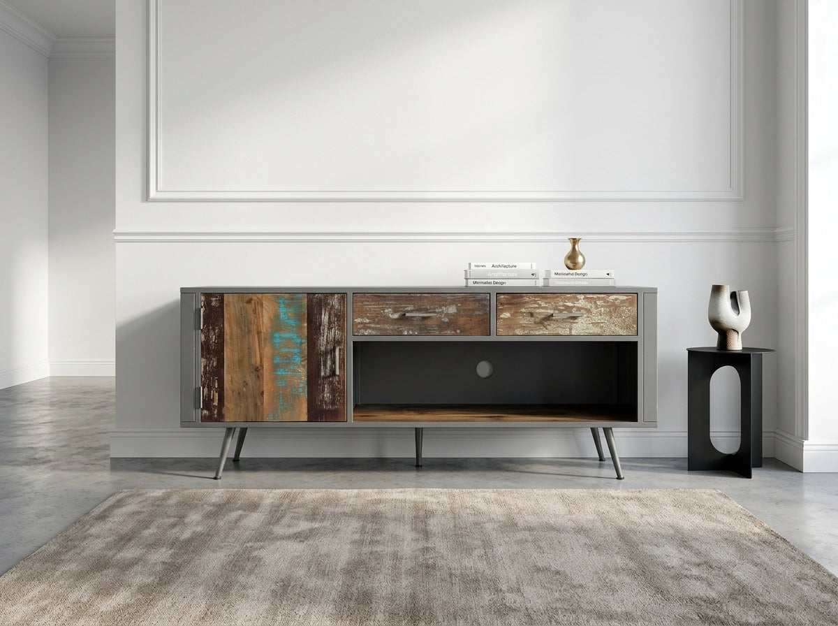 Structure en métal gris et façades en bois recyclé. Une silhouette architecturale aux lignes nettes qui privilégie la fonction. Ce meuble intègre un rangement ordonné et un passage de câbles discret, affirmant un style brut et sans artifice pour un salon moderne et épuré.