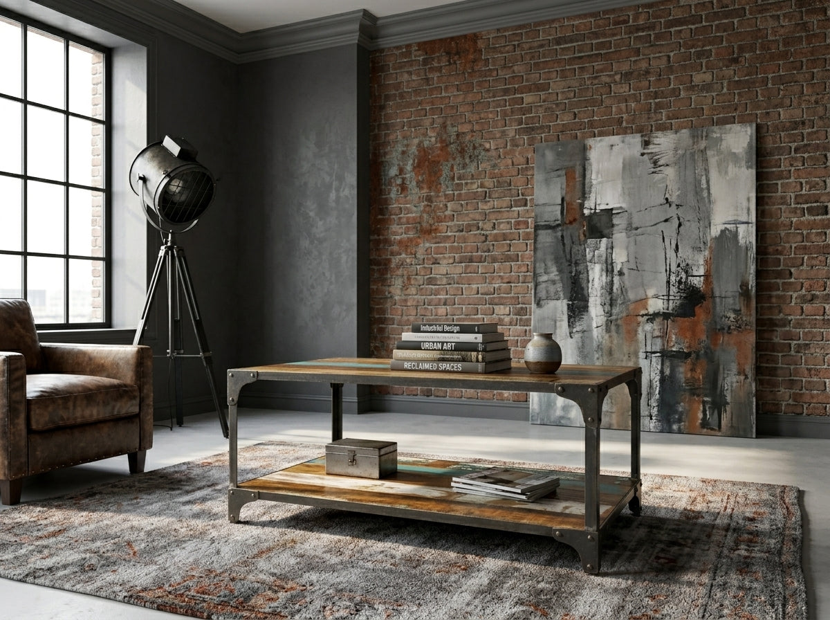 Cette table basse fusionne le caractère brut du bois de récupération et la rigueur de l'acier. Ses finitions vieillies révèlent des textures authentiques, tandis que le cadre métallique riveté assure une stabilité robuste. Un équilibre parfait entre esthétique industrielle et fonctionnalité quotidienne grâce à son étagère de rangement intégrée.