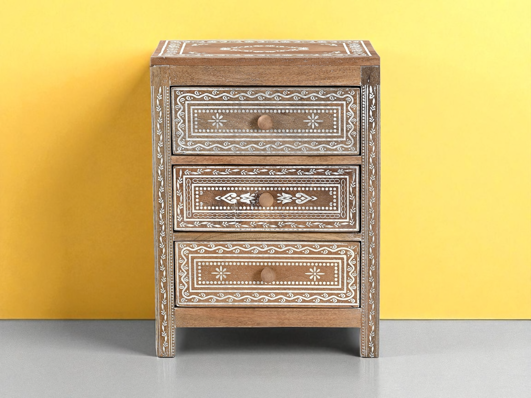 Cette table de nuit en bois de manguier blanchi apporte une touche naturelle à votre chambre. Dotée de trois tiroirs spacieux, elle est idéale pour garder vos essentiels de nuit bien organisés et à portée de main.